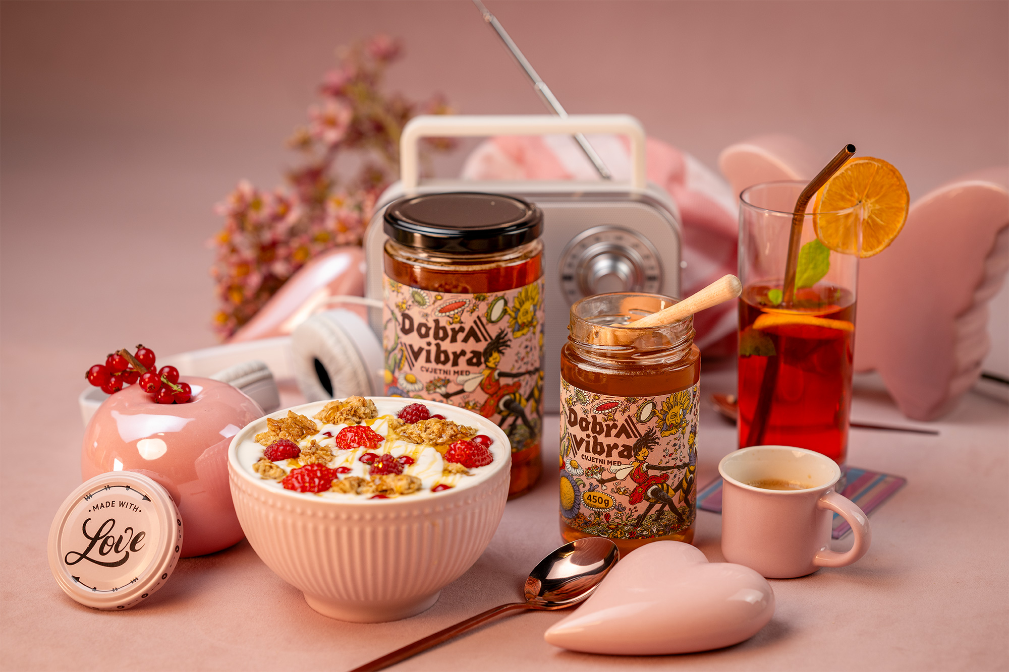 Photographing the Good Vibes product line from Varzak Honey was a project where we aimed not only for aesthetic perfection, but also for a deep connection between the product and its visual presentation. As a team, we dedicated ourselves to creating a visual experience that highlights the quality and meticulous care behind Varžak Honey, using rich, thoughtfully arranged sets with a complete thematic backdrop. Every aspect of this project was carefully designed to achieve a monochromatic retro style that reflects the pastel labels of the honey, creating a harmonious and captivating whole.