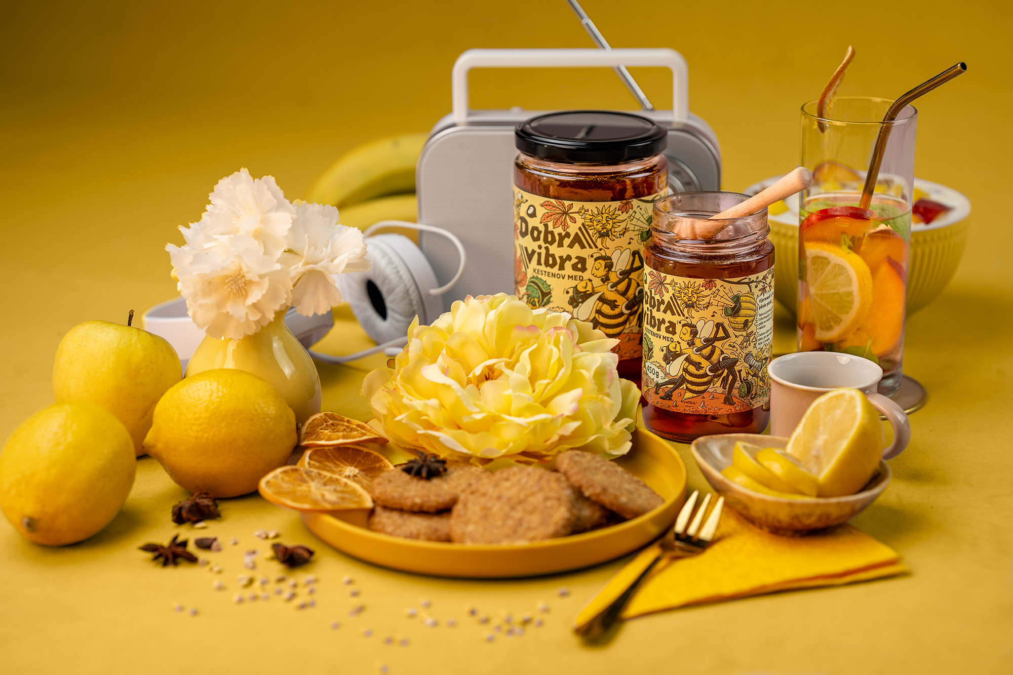 Once everything was gathered, we moved to scene setup—designing a sophisticated and dynamic environment with meticulous care. Given the “Good Vibes” theme and its swing-inspired energy (inspired by the dance of bees), we used props like retro headphones and radios to emphasize that rhythmic spirit. The scene was crafted to showcase the energy and personality of each honey, producing a visually attractive space that communicates a joyful, lively atmosphere.